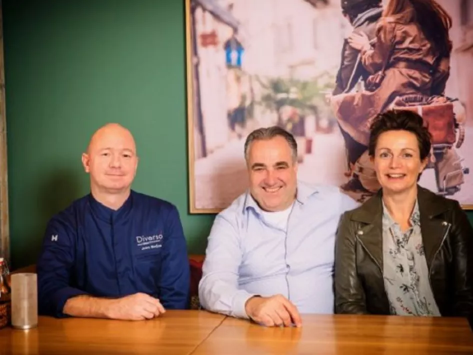 Die Terrasse des Restaurants Diverso befindet sich auf der Rückseite des Gebäudes. Dies ist ein ruhiger Ort im Grünen. Terrasse, Garten und Parkplatz sind großzügig angelegt und der alte Baumbestand sorgt für eine rustikale Atmosphäre. Die Terrasse bietet Platz für 80 Gäste in bequemen Rattanstühlen. Der Kamin wird regelmäßig angezündet. Dieser Ort eignet sich hervorragend für Mittag- und Abendessen sowie Getränke für kleine und große Gruppen. Decken und Terrassenheizung werden bereitgestellt, um die Natur so lange wie möglich zu genießen.