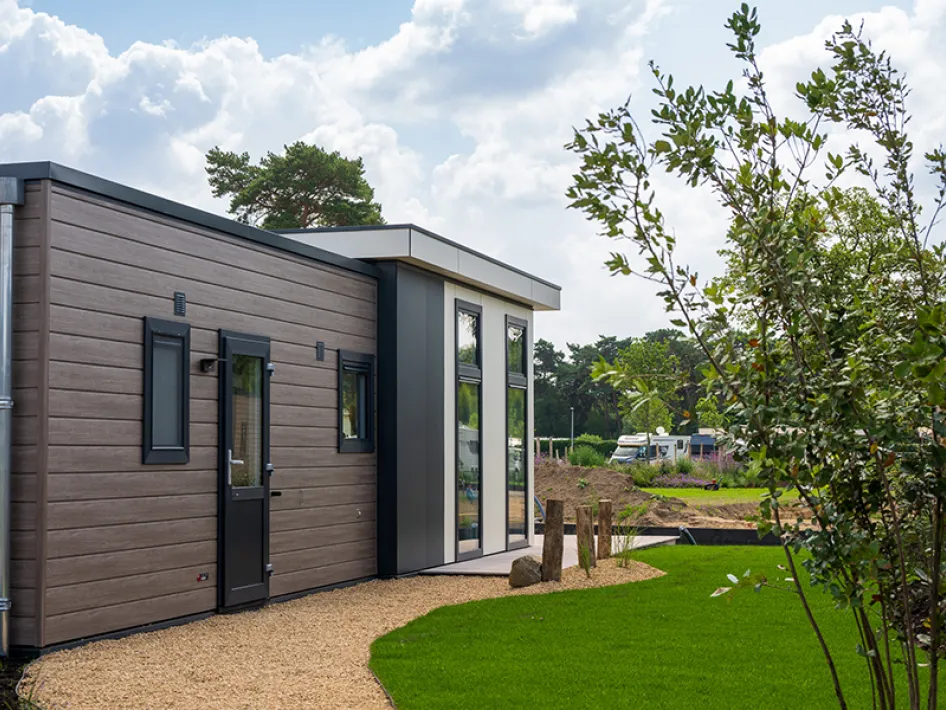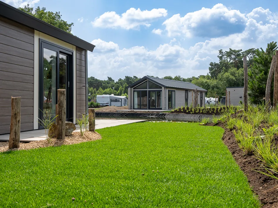 The models and colours of the holiday homes have been carefully selected to blend harmoniously into the natural landscape. Thanks to the large windows and glass doors, indoor and outdoor spaces flow seamlessly into one another, allowing you to experience nature even indoors. The design and placement of the homes on the spacious plots ensure that each holiday home fits beautifully into its surroundings.