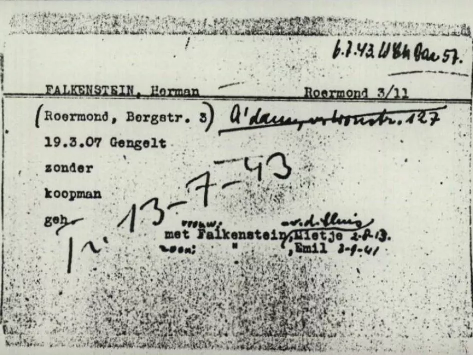 Stolpersteine in memory of Hermann Falkenstein en zijn vrouw Mietje Falkenstein-van der Sluis. The Police Commissioner of Roermond requested the search, arrest and presentation of Hermann Falkenstein and his wife Mietje van der Sluis. They were living in Roermond and suspected of changing their place of residence without the required permit. This description was used for Jews who were in hiding. A request for search was also made regarding a child of this couple. General Police Gazette, no. 39, October 1, 1942, 1113, message 2121.