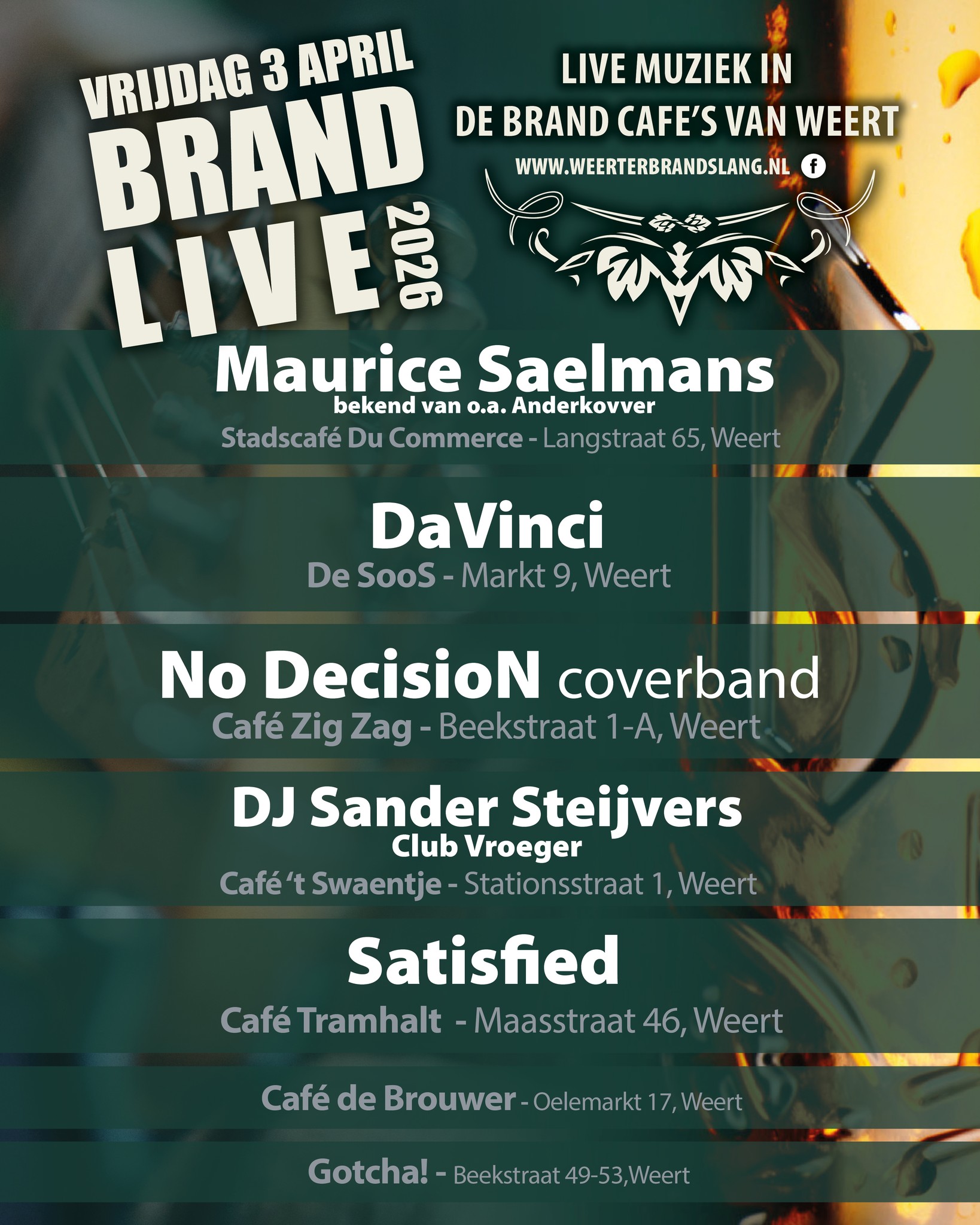 Op vrijdag 3 april komt Weert tot leven tijdens Brand LIVE!. Bezoekers worden meegenomen door de klanken van livebands en dj’s, verspreid over de Brandcafés die verbonden zijn met de Weerter Brandslang in de binnenstad.