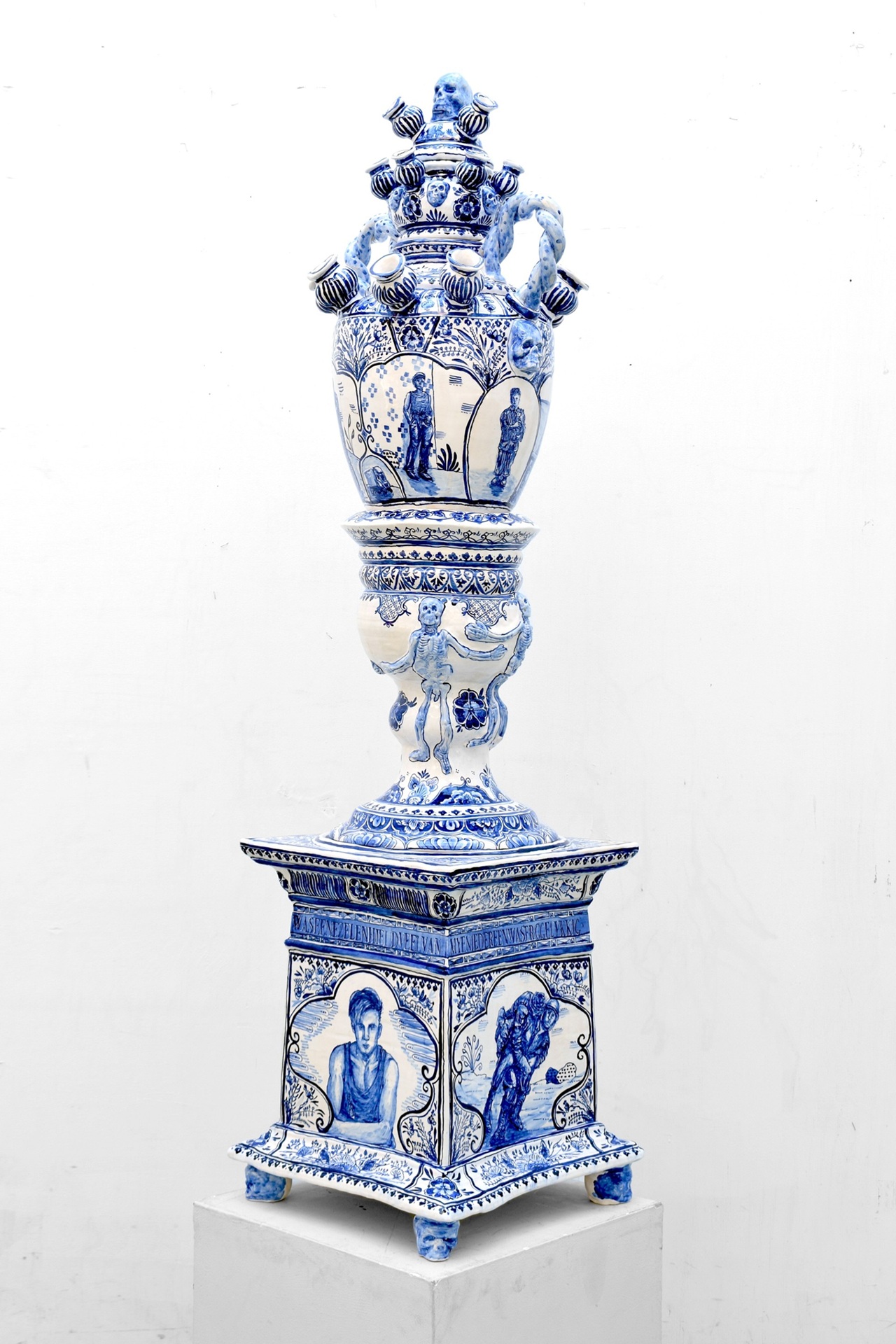 In het keramische werk van kunstenaar Chris Rijk komen traditie en provocatie samen. Hij combineert de klassieke beeldtaal van Delfts blauw aardewerk met hedendaagse, onconventionele en vaak humorvolle elementen. Zijn oeuvre omvat herkenbare vormen uit de keramiektraditie, zoals borden, vazen en schotels, maar ook verrassende objecten als gouden Crocs, toiletpotten en keramische butt plugs. Elk werk is rijk beschilderd met verfijnde Delfts blauwe motieven, waarin Rijk verwijst naar thema’s als queeridentiteit, erotiek, machtsverhoudingen en populaire cultuur.