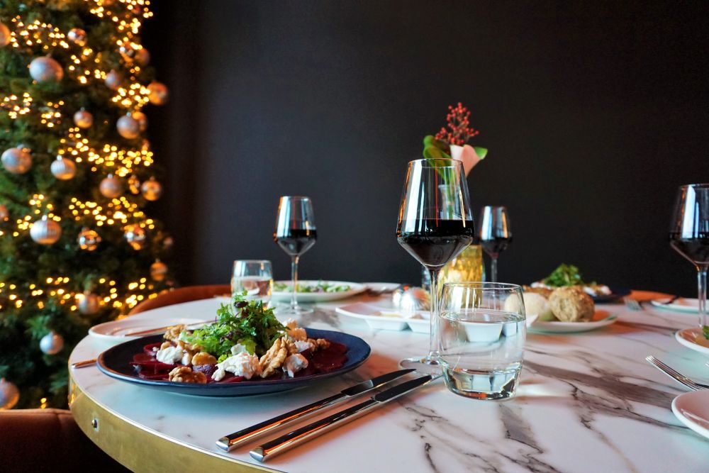 Gedekte tafel voor het Kerst Diner Dansant bij Parkhotel Horst, met feestelijke gerechten, rode wijn en een versierde kerstboom op de achtergrond.