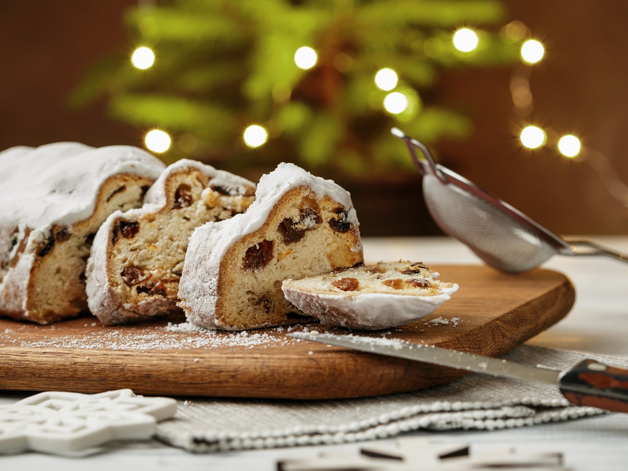 Kerststol geserveerd tijdens een kerstbrunch bij Parkhotel Horst, met warme kerstverlichting op de achtergrond.