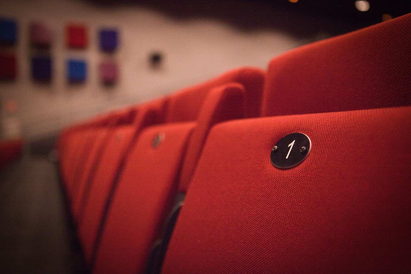 Close-up van een rode theaterstoel met stoelnummer 1 in een lege zaal van de Bombardon