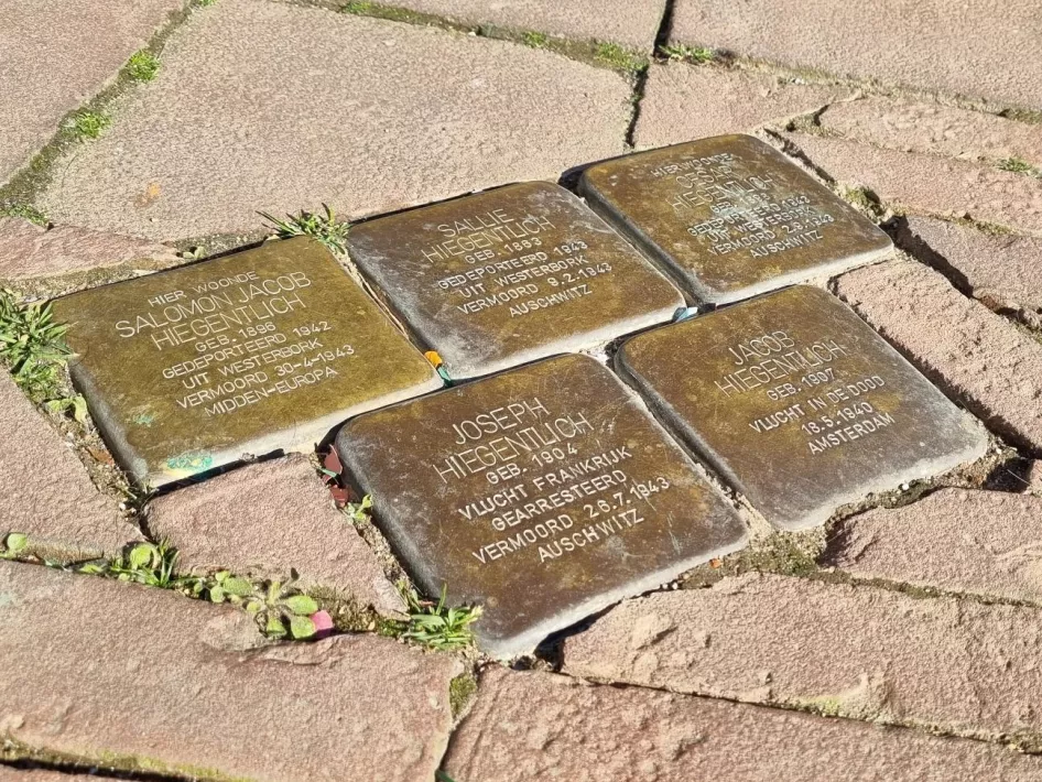 Stolpersteine vijf stuks voor de familie Hiegentlich. Sallie Hiegentlich was koopman in manufacturen. Rond 1896 vestigde hij zich in Roermond. Sallie Hiegentlich was getrouwd met Rosalia Egger. Het echtpaar kreeg vijf kinderen waarvan er een de oorlog overleefde. Rosalia Egger overleed in december 1927. Korte tijd later, waarschijnlijk in 1929 verhuisde Sallie Hiegentlich naar Nieuwer-Amstel.